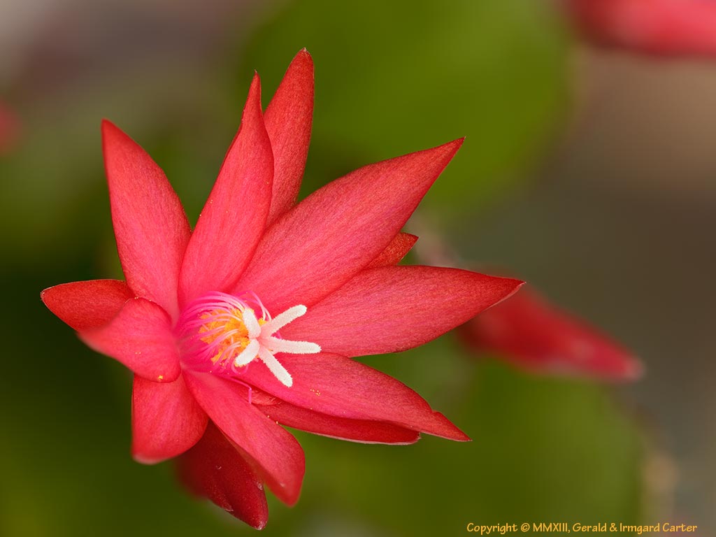 Our Easter Cactus opened its flowers exactly on easter in 2013. (Okay -- a couple opened a little bit a day earlier) The flowers are fairly small, just a little bit bigger than a thumbnail. Consequently any photograph of them would have very little depth of focus. However this picture was made with a technique called "focus stacking" where many pictures are made while slowly turning the camera's focus. A computer program then selects the sharpest part of each photograph and merges them into this final image.