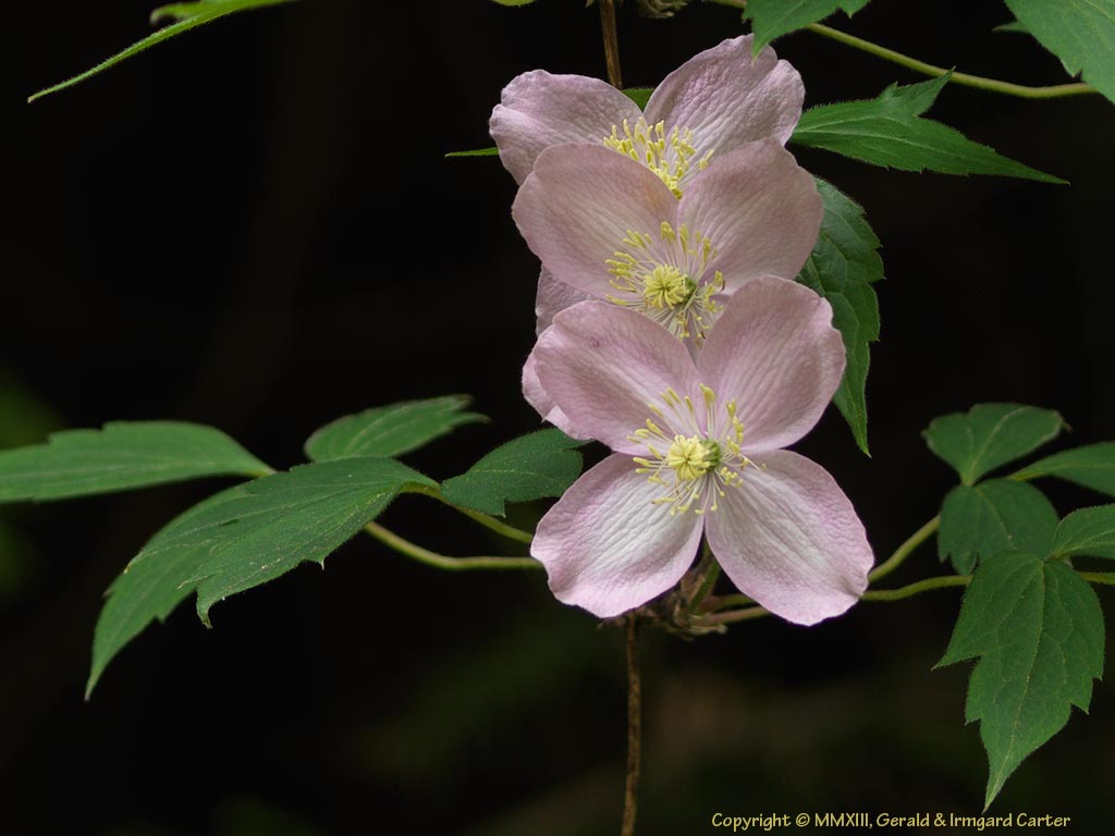 There are many subspecies and varieties of Clematis quite different looking flowers. This particular one was dropping off of a Western Red Cedar. The flowers resemble the "Traveler's Joy", a variety from South Africa, but we are not certain which one we have here. The picture above is a crop from a picture showing more of the vine, the original photograph is below.