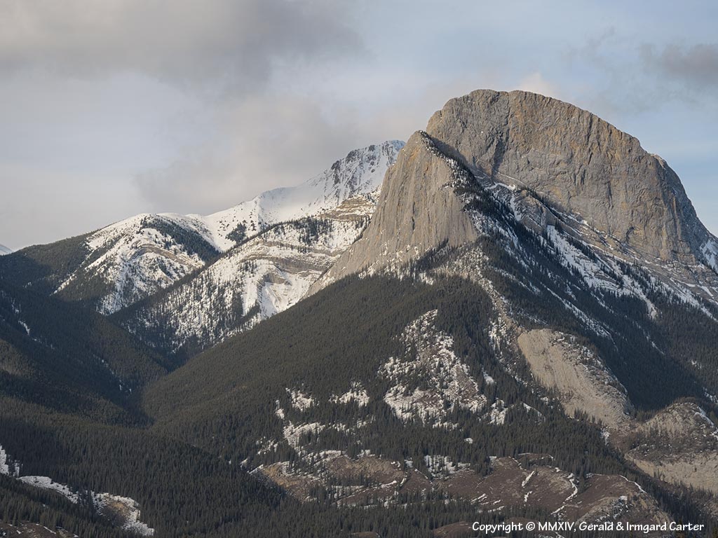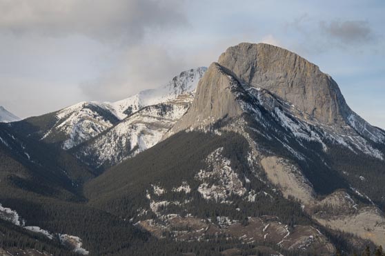 Our Nikon D300 started its working career off very well, scoring several very good images in its first day on the job. This is on of them, a picture of a mountain north of Jasper about halfway bewteen the village and the park boundary. The low winter sun is grazing along the surface of the cliff, providing some extra colour and plenty of detail which is easily seen in larger scale.
