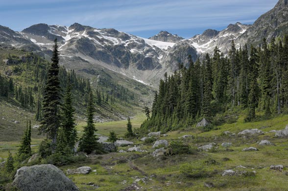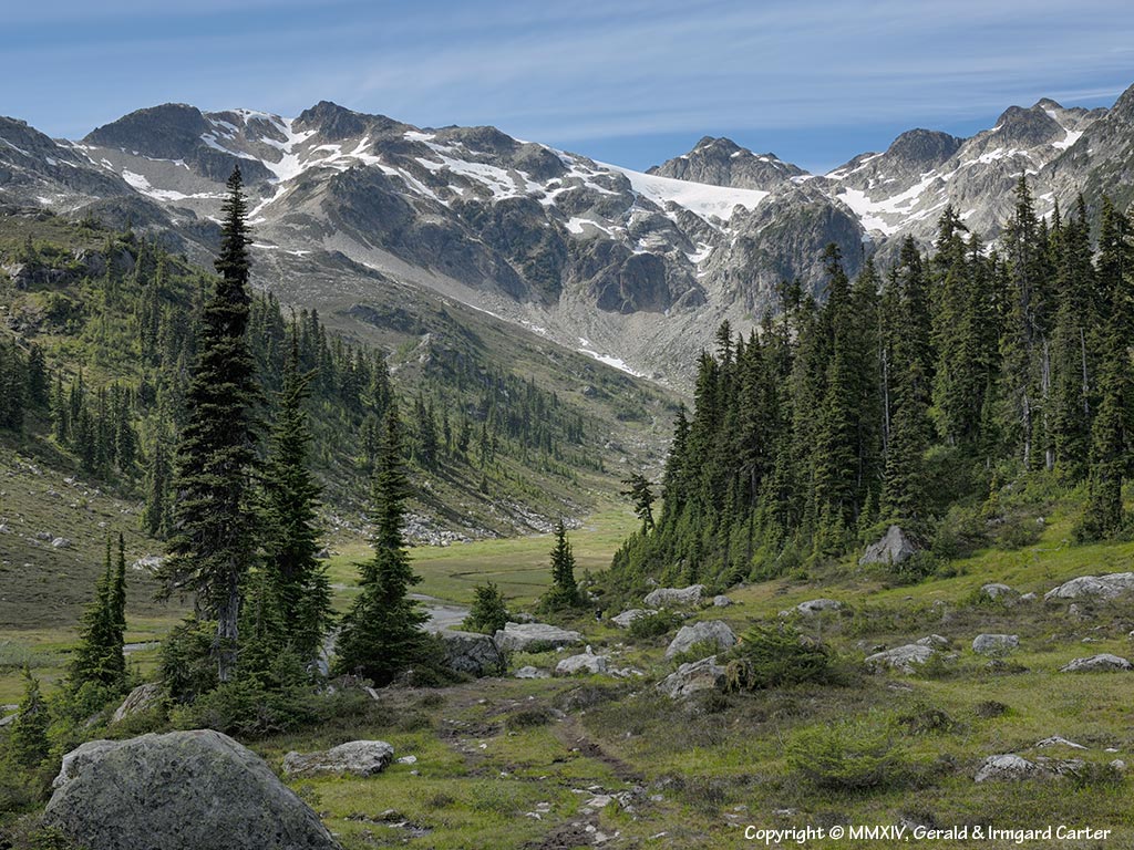 On the scenic road between Vancouver and the ski resort village of Whistler there is a popular park, Brandywine Falls. On the other side of that park is a rough logging road that leads to Brandywine Mountain and other interesting spots. The hanging valley in this photograph is the home of Brandywine Meadows.