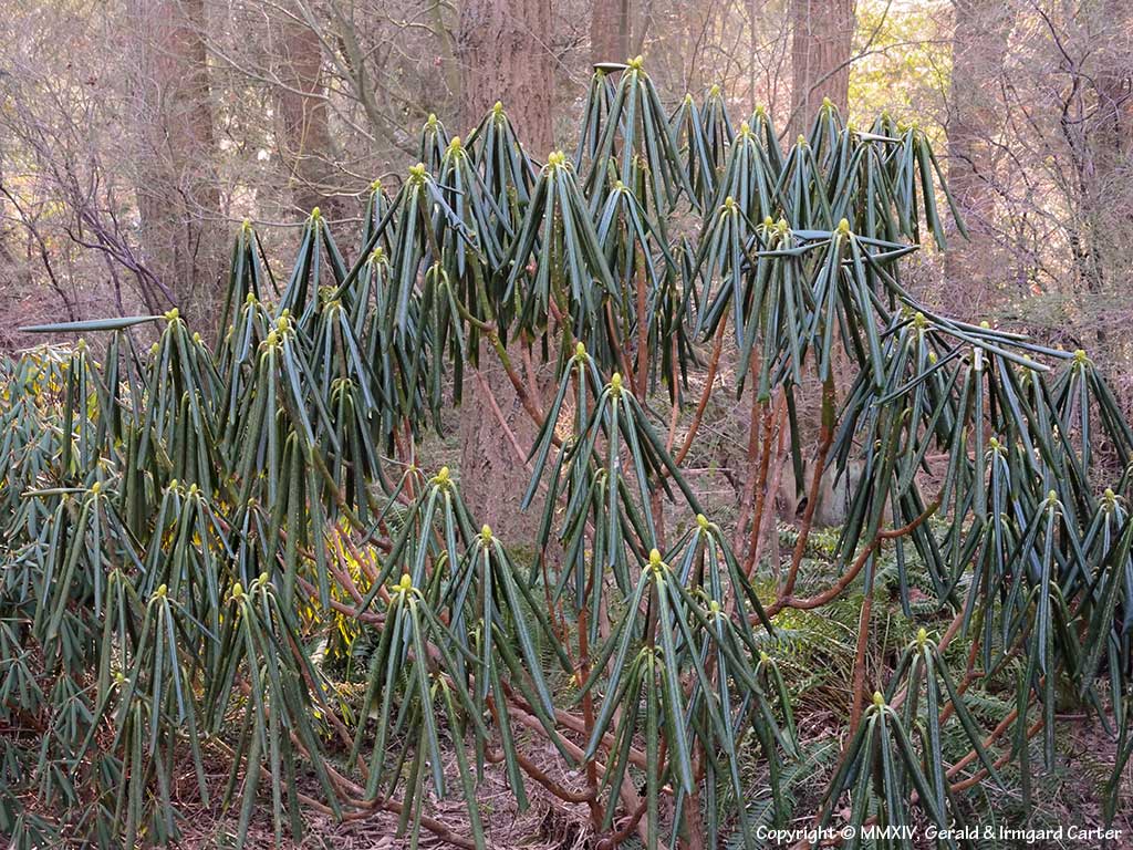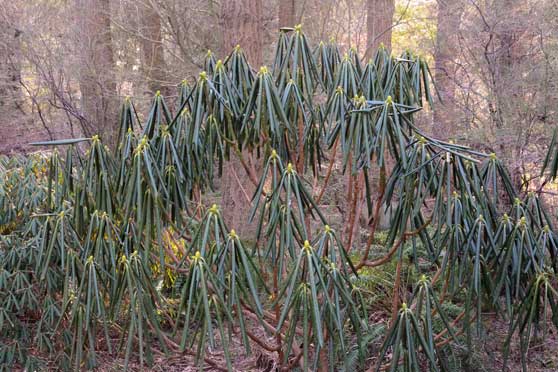 It had been dry and a little below freezing for a week when this photograph was taken. The leaves of this Rododendron, normally broad, are curled up tight in response. Normally the foliage is so thick that the structure of the plant is hidden, but here we can see it clearly. You can tell this was taken mid-winter, the yellow-green buds are obvious. Each will host a bouquet of flowers come spring.