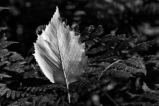 This Sitka Alder leaf fell onto some bracken and was lit by a small spot of sunlight breaking through the forest canopy. Alder leaves don't turn colour much, they just fall from the tree maybe a little lighter in shade and maybe a little more brown in tone. Fortunately our camera was right at hand because the spot of light only lasted for a few seconds. This image was envisioned from before the shutter button was pushed. The light coming from the right side was almost at the same plain as the leaf, amplifying its structure and texture. We find that black & white photographs emphasize texture in comparison to conventional clolour pictures.