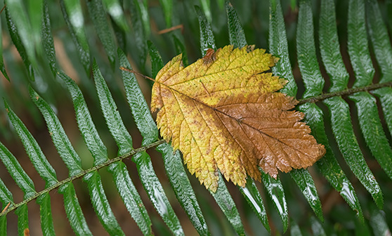 There are three Salmonberry leaves on a stem, as seen on the picture on the right. In the fall they turn colour, as the plant absorbs nutrients out of the trees to save over the winter. These nutrients are needed to maintain the chlorophyll that is key to photosynthesis and the leaves' green colour. Without the nutrients, the chlorophyll breaks down, changing the leaf's colour.